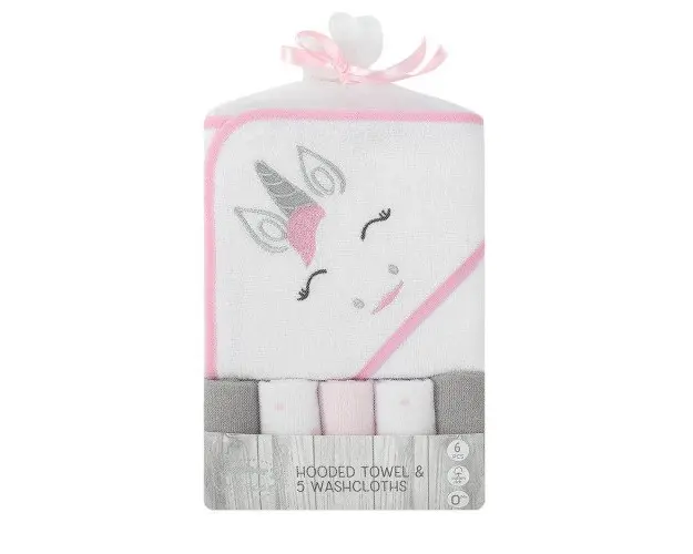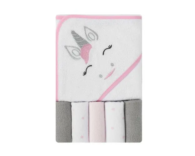 Set cadou bebelusi cu 5 mini prosopele si prosop cu gluga unicorn