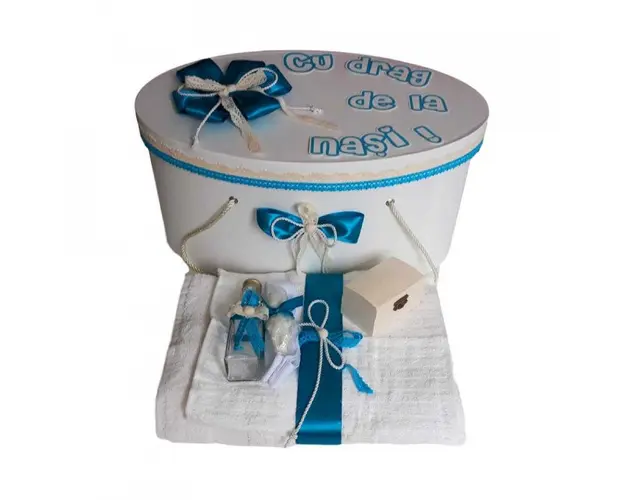 Set cutie trusou personalizata si trusou botez, decor turcoaz Denikos® 237 DESCRIERE Set special creat pentru ceremonia de botez. Setul este alcatuit din trusou complet pentru botez si o cutie personalizata cu mesajul "Cu drag de la nasi!" Trusoul pentru botez contine: - prosop mare pentru bebelus, dimensiuni 70 x 140 cm, 100% bumbac; - panza de mir, 100% bumbac; - prosop pentru preot, dimensiuni 30 x 50 cm, 100% bumbac; - fasa de botez, dimensiune 150 cm; - sticluta de mir, capacitate 100 ml; - sapunel in forma de bebelus; - cutiuta pentru suvita de par. Cutia este special creata pentru transportul trusoului de botez si a hainutelor bebelusului. Cutia are forma ovala si este realizata din carton gros, rezistent. Poate fi utilizata dupa botez ca si cutie de depozitatre a jucariilor sau a amintirilor dragi. Cutia este prevazuta cu doua manere, necesare in timpul transportului. PERSONALIZARE Cutia de trusou este personalizata cu mesajul "Cu drag de la nasi!" Dimesiuni cutie: 45 x 28 x 22 cm Produsul cu denumirea Set cutie trusou personalizata si trusou botez, decor turcoaz Denikos® 237 face parte din brandul Produs vandut si livrat de sc denikos creativ shop online srl, se afla in categoria Barbie si subcategoria