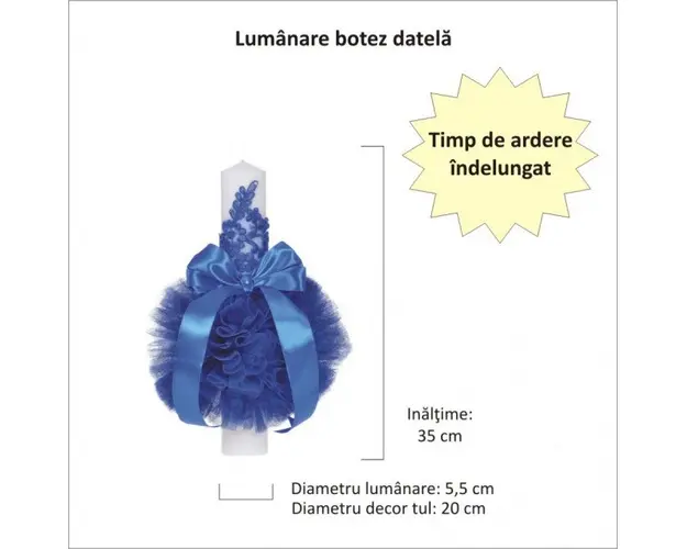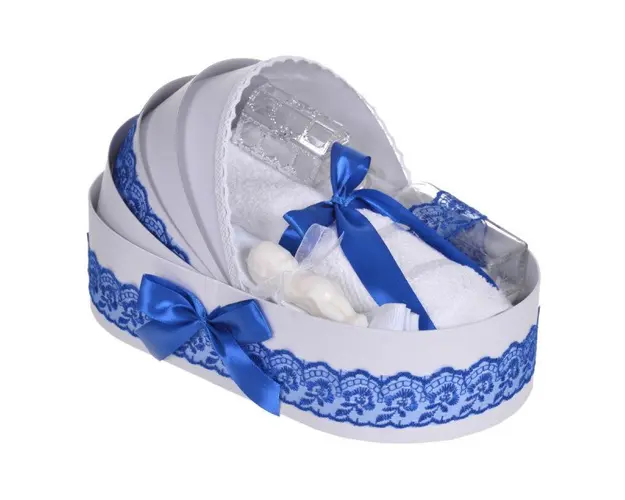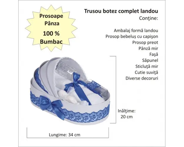Set elegant lumanare botez si trusou botez in landou, decor dantela Albastra, Denikos® 885 DESCRIERE Set special creat pentru ceremonia de botez. Setul este alcatuit din trusou complet ambalat intr-o cutie tip landou si o lumanare decorata cu un glob din tul albastru, dantela si fundita asortata. Setul contine: - cutie de trusou in forma de landou; - prosop cu gluga pentru bebelus, dimensiuni 80 x 80 cm, 100% bumbac; - panza de mir, 100% bumbac; - prosop pentru preot, dimensiuni 30 x 50 cm, 100% bumbac; - fasa de botez, dimensiune 150 cm; - sticluta de mir, capacitate 100 ml; - sapunel in forma de bebelus; - cutiuta pentru suvita de par. - lumanare de botez (35 cm inaltime). PERSONALIZARE Trusoul se poate personaliza cu numele copilului. Numele copilului poate fi scris prin brodare pe prosopul copilului, panza si fasa (cost suplimentar). Daca doresti personalizare, alege la optiuni cu personalizare si te vom contacta telefonic pentru a stabili detaliile. Produsul cu denumirea Set elegant lumanare botez si trusou botez in landou, decor dantela Albastra, Denikos® 885 face parte din brandul Produs vandut si livrat de sc denikos creativ shop online srl, se afla in categoria Barbie si subcategoria