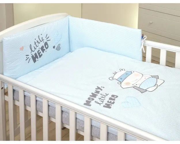 Set lenjerie din bumbac cu protectie laterala pentru pat bebelusi Hero Blue 120 x 60 cm