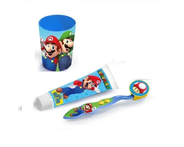 Set pahar pasta de dinti periuta si etui pentru ingrijire dentara Super Mario pentru copii