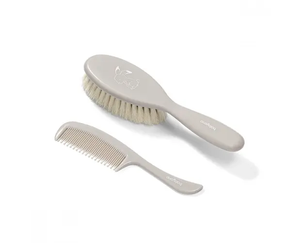 Set perie par natural si pieptene- BabyOno Perie cu fir natural moale, ideal pentru parul delicat si scalpul nou nascutilor Antistatic Pieptene cu dinti rotunjiti ce protejeaza si maseaza scalpul c Produsul cu denumirea Set perie din par natural super moale si pieptene Bunny Grey face parte din brandul Ok baby, se afla in categoria Igiena si ingrijire si subcategoria