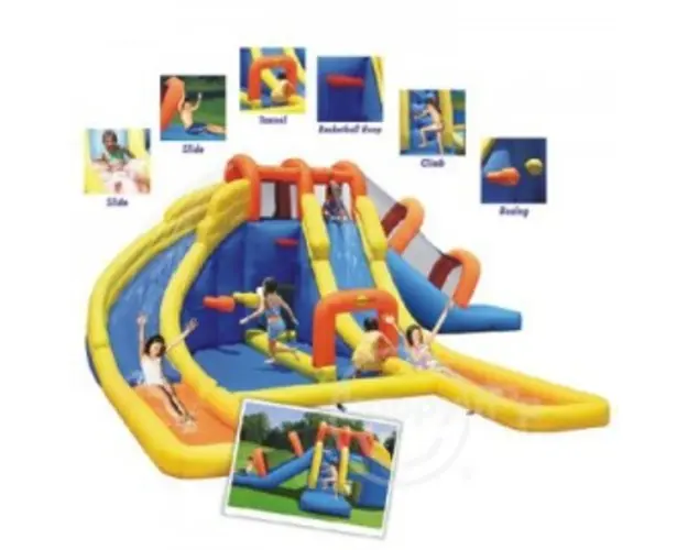 Spatiu de joaca gonflabil Mini water park Spatiu de joaca gonflabil cu apa. Spatiul de joaca este gata de folosit in maxim 2 minute si este conectat in permanenta la un compresor de aer. Materialele folosite sint de o calitate foarte buna, plasa de siguranta din dotare asigura protectia utilizatorilor. Caracteristici: saltea cu apa, spatiu de catarat, spatiu de sarit, doua tobogane cu apa, cos de baschet, loc de catarat, tunel Pachetul contine: spatiul de joaca; compresor; geanta de transport; kit pentru reparatii minore; manual cu instructiuni in limba romana; Caracteristici tehnice: material PVC industrial cu cusatura dubla; standarde de calitate : CE/EN71; GS; EMC/BS/SAA; 00.3/16CFR1505; UL; ASTM Greutate proprie: 42 kg. Greutate maxima admisa: 270 Kg. Maxim 5 jucatori in acelasi timp. Nota: Apa nu este recirculata! Dimensiuni dupa asamblare:735x630x250 cm. Caracteristici: saltea cu apa, spatiu de catarat, spatiu de sarit, doua tobogane cu apa, cos de baschet, loc de catarat, tunel, Produsul cu denumirea Spatiu de joaca gonflabil Mini water park face parte din brandul Happy hop, se afla in categoria Spatii de joaca din lemn si subcategoria
