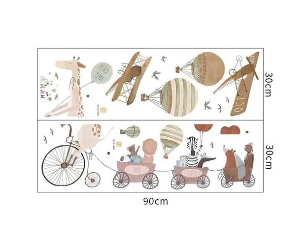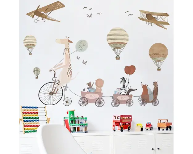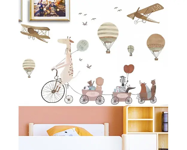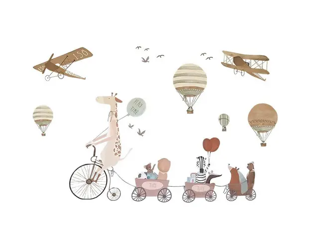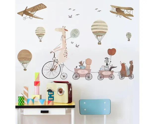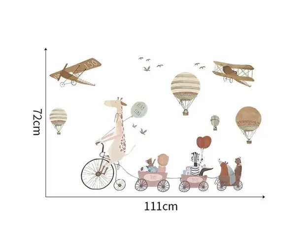Sticker decorativ pentru copii autoadeziv Girafa pe bicicleta si prietenii 72x111 cm