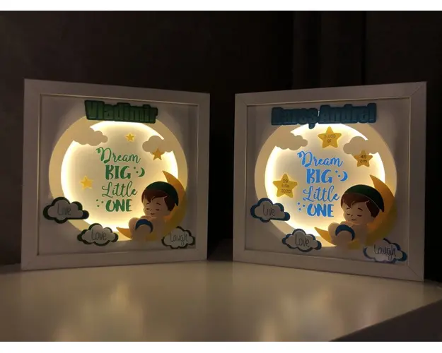 Folosite ca lampa de veghe pentru cei mici sau ca decor luminos 3D pentru cei mari, tablourile create in atelierul Noor emana o lumina calda si placuta, perfecta pentru povestile de la culcare sau ca Produsul cu denumirea Tablou luminos Baietel 001 face parte din brandul Noorhandmadeatelier, se afla in categoria Costume carnaval copii si subcategoria
