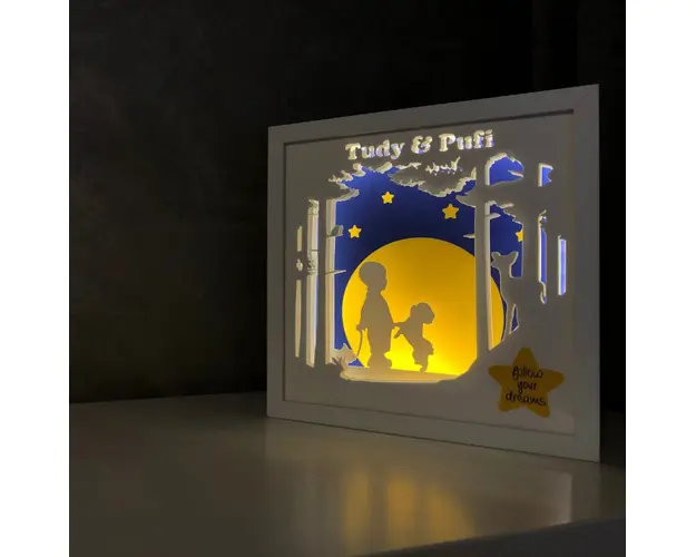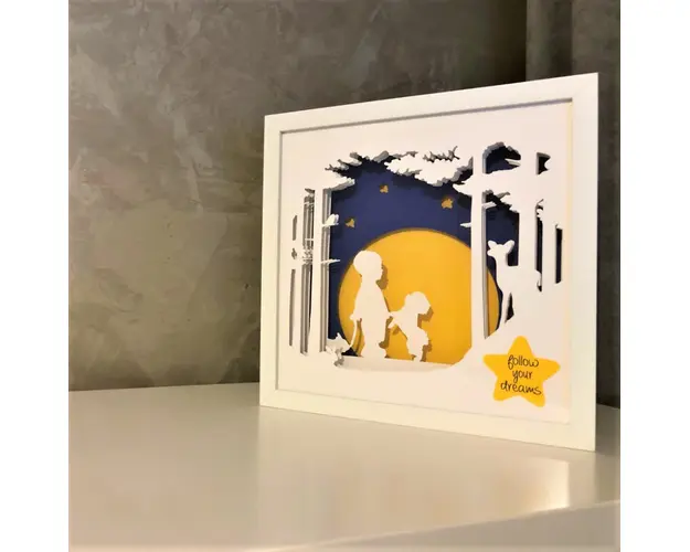 Folosite ca lampa de veghe pentru cei mici sau ca decor luminos 3D pentru cei mari, tablourile create in atelierul Noor emana o lumina calda si placuta, perfecta pentru povestile de la culcare sau ca Produsul cu denumirea Tablou luminos Baietel 019 face parte din brandul Noorhandmadeatelier, se afla in categoria Costume carnaval copii si subcategoria