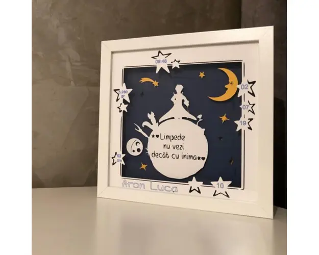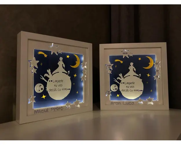 Sunt piese unicat, personalizate, care spun o poveste imaginativa prin iluminarea hartiei decupate si creeaza o atmosfera magica in incaperea in care sunt expuse, adaugand o nota de originalitate.nbsp Produsul cu denumirea Tablou luminos Baietel 028 face parte din brandul Noorhandmadeatelier, se afla in categoria Costume carnaval copii si subcategoria