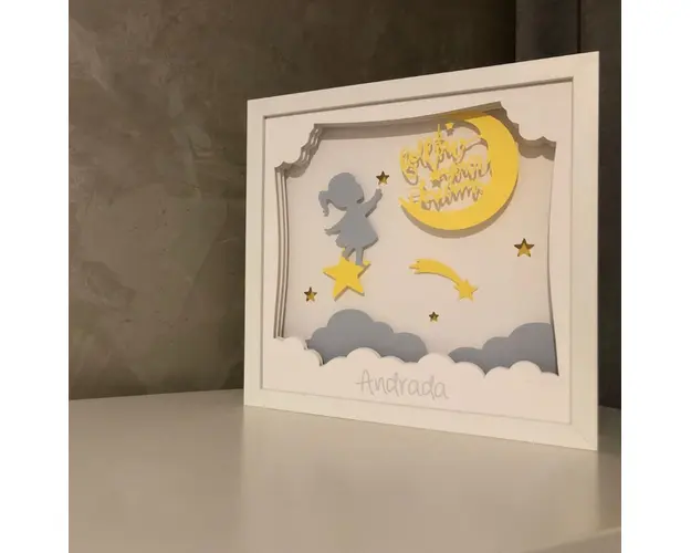 Folosite ca lampa de veghe pentru cei mici sau ca decor luminos 3D pentru cei mari, tablourile create in atelierul Noor emana o lumina calda si placuta, perfecta pentru povestile de la culcare sau ca Produsul cu denumirea Tablou luminos Fetita 023 face parte din brandul Noorhandmadeatelier, se afla in categoria Costume carnaval copii si subcategoria