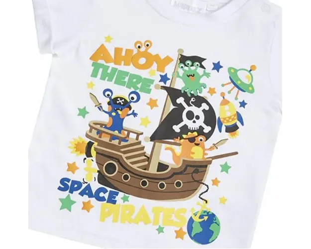 Marime: 3-6, 6-9, 9-12, 12-18, 18-24 luni Tricou alb pentru baietei, imprimat o corabie de pirati si cu desene viu colorate. Material: 100% bumbac Produsul cu denumirea Tricou baietei - Space pirates face parte din brandul Eurobaby, se afla in categoria Prepararea hranei si subcategoria