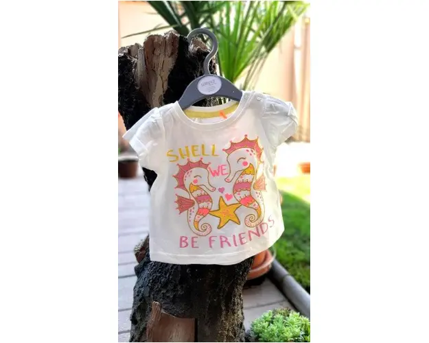 Marime: 0-3, 3-6, 6-9, 9-12, 12-18, 18-24 luni Tricou alb pentru fetite, imprimat cu doi caluti de mare. Se inchide cu nasturei pe umar. Produsul cu denumirea Tricou fetite - Be friends face parte din brandul Eurobaby, se afla in categoria Prepararea hranei si subcategoria