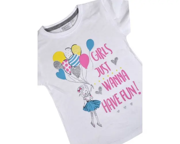 Marime: 2, 3, 4, 5 ani Tricou alb pentru fetite, imprimat cu inscriptie roz si cu o fetita cu baloane colorate. Material: bumbac 100% Produsul cu denumirea Tricou fetite - Girls wanna have fun face parte din brandul Eurobaby, se afla in categoria Prepararea hranei si subcategoria