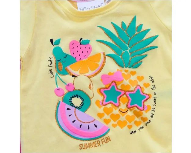 Marime: 0-3, 3-6, 6-9, 9-12, 12-18, 18-24 luni Tricou galben pentru fetite, imprimat cu fructe tropicale viu colorate. Produsul cu denumirea Tricou fetite - Summer fun face parte din brandul Eurobaby, se afla in categoria Prepararea hranei si subcategoria