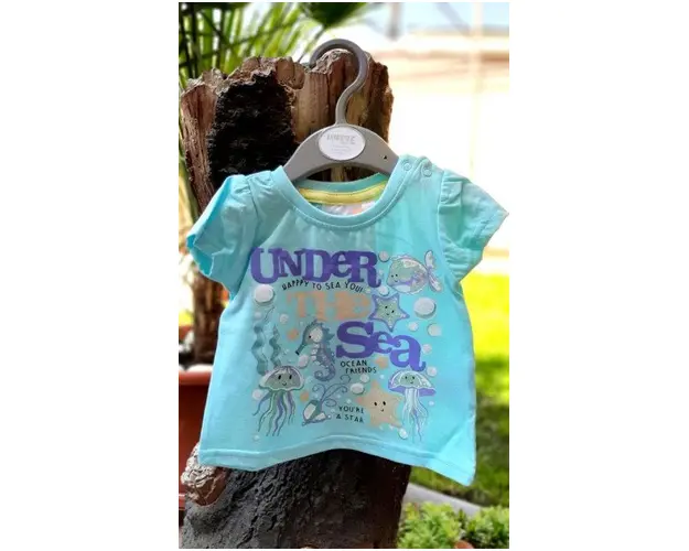 Marime: 0-3, 3-6, 6-9, 9-12, 12-18, 18-24 luni Tricou bleu pentru fetite, cu imprimeu marin si cu inscriptie. Se inchide cu nasturei pe umar. Produsul cu denumirea Tricou fetite - Under the sea face parte din brandul Eurobaby, se afla in categoria Prepararea hranei si subcategoria