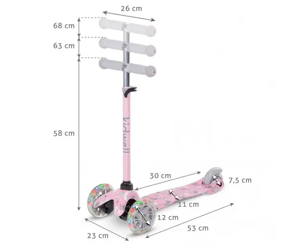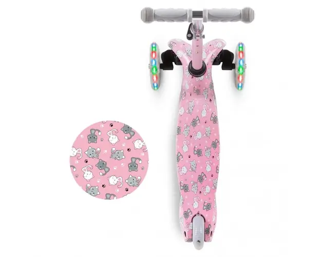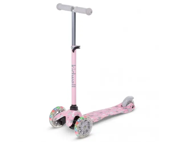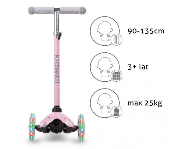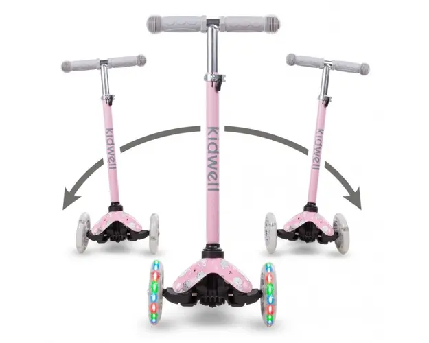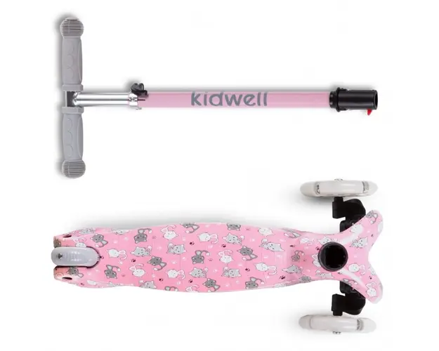 Structura durabila, usoara, cantarind 1.8 kg. Platforma larga de pe rotile din fata ajuta la mentinerea echilibrului.Rotile din poliuretan silentioase si durabile asigura o aderenta foarte buna la sol Produsul cu denumirea Trotineta Kidwell uno Cats Roz face parte din brandul Kiddieland, se afla in categoria Litere- limbaj- cifre si subcategoria