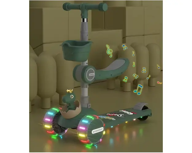 Trotineta pliabila cu scaunel muzica si roti luminoase LED Nichiduta Pink Dino