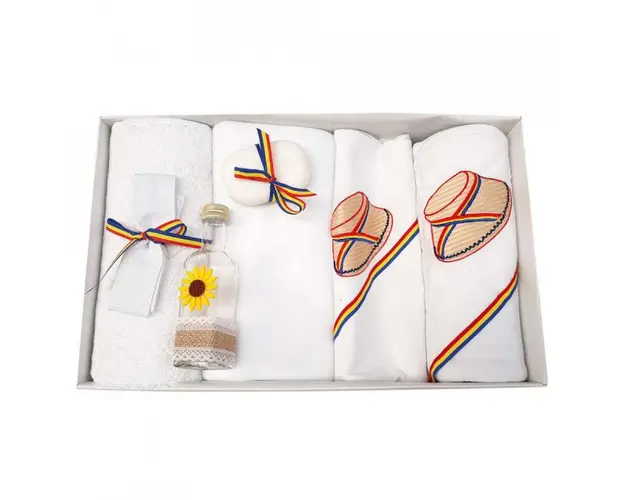 Trusou botez brodat si lumanare pentru baietel, decor traditional, Denikos® 120 DESCRIERE Set special creat pentru ceremonia de botez a unui baietel. Setul este alcatuit din trusou complet ambalat intr-o cutie dreptunghiulara si o lumanare decorata cu elemente rustice. Setul contine: - cutie de trusou cu capac transparent; - prosop cu gluga pentru bebelus, dimensiuni 80 x 80 cm, 100% bumbac; - panza de mir, 100% bumbac; - prosop pentru preot, dimensiuni 50 x 70 cm, 100% bumbac; - fasa de botez, dimensiune 100 cm; - sticluta de mir, capacitate 100 ml; - sapunel; - paturica cocolino, dimensiune 80 x 80cm - lumanare de botez (35 cm inaltime). Trusoul de botez este decorat rustic prin brodare. Acest model de trusou nu se poate personaliza cu numele copilului. Produsul cu denumirea Trusou botez brodat si lumanare pentru baietel, decor traditional, Denikos® 120 face parte din brandul Produs vandut si livrat de sc denikos creativ shop online srl, se afla in categoria Barbie si subcategoria