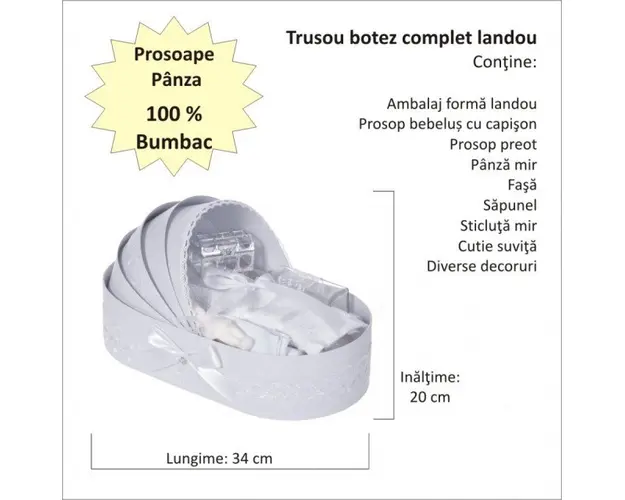 Trusou botez complet, in landou, decor dantela alba, diafana, Denikos® 834 DESCRIERE Trusou de botez elegant pentru baietel, special creat pentru ceremonia de botez. Trusoul este ambalat intr-o cutie tip landou si decorat cu dantela alba si fundite asortate. Trusoul contine: - cutie de trusou in forma de landou; - prosop cu gluga pentru bebelus, dimensiuni 80 x 80 cm, 100% bumbac; - panza de mir, 100% bumbac; - prosop pentru preot, dimensiuni 30 x 50 cm, 100% bumbac; - fasa de botez, dimensiune 150 cm; - sticluta de mir, capacitate 100 ml; - sapunel in forma de bebelus; - cutiuta pentru suvita de par. PERSONALIZARE Trusoul se poate personaliza cu numele copilului. Numele copilului poate fi scris prin brodare pe prosopul copilului, panza si fasa (cost suplimentar). Daca doresti personalizare, alege la optiuni cu personalizare si te vom contacta telefonic pentru a stabili detaliile. Produsul cu denumirea Trusou botez complet, in landou, decor dantela alba, diafana, Denikos® 834 face parte din brandul Produs vandut si livrat de sc denikos creativ shop online srl, se afla in categoria Barbie si subcategoria