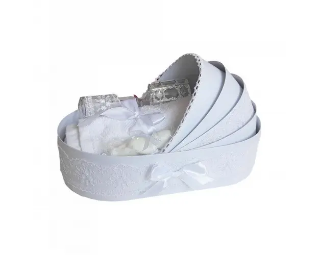 Trusou botez complet, in landou, decor diafan cu dantela alba Denikos® 148 DESCRIERE Trusou de botez elegant pentru baietel sau fetita, special creat pentru ceremonia de botez. Trusoul este ambalat intr-o cutie tip landou si decorat cu fundite si dantela alba. Trusoul contine: - cutie de trusou in forma de landou; - prosop cu gluga pentru bebelus, dimensiuni 80 x 80 cm, 100% bumbac; - panza de mir, 100% bumbac; - prosop pentru preot, dimensiuni 30 x 50 cm, 100% bumbac; - fasa de botez, dimensiune 150 cm; - sticluta de mir, capacitate 100 ml; - sapunel in forma de bebelus; - cutiuta pentru suvita de par. PERSONALIZARE Produsul se poate personaliza cu numele copilului. Numele copilului poate fi scris prin brodare pe prosopul copilului (in coltul de jos al prosopului, opus capisonului), panza si fasa (cost suplimentar). Daca doresti personalizare, alege la optiuni cu personalizare si te vom contacta telefonic pentru a stabili detaliile. Produsul cu denumirea Trusou botez complet, in landou, decor diafan cu dantela alba Denikos® 148 face parte din brandul Produs vandut si livrat de sc denikos creativ shop online srl, se afla in categoria Barbie si subcategoria
