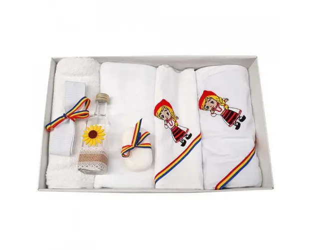 Trusou botez fetita brodat si lumanare, decor rustic, Denikos® 124 DESCRIERE Set special creat pentru ceremonia de botez a unei fetite. Setul este alcatuit din trusou complet ambalat intr-o cutie dreptunghiulara si o lumanare decorata cu elemente rustice. Setul contine: - cutie de trusou cu capac transparent; - prosop cu gluga pentru bebelus, dimensiuni 80 x 80 cm, 100% bumbac; - panza de mir, 100% bumbac; - prosop pentru preot, dimensiuni 50 x 70 cm, 100% bumbac; - fasa de botez, dimensiune 100 cm; - sticluta de mir, capacitate 100 ml; - sapunel; - paturica cocolino, dimensiune 80 x 80cm - lumanare de botez (35 cm inaltime). Trusoul de botez este decorat rustic prin brodare. Acest model de trusou nu se poate personaliza cu numele copilului. Produsul cu denumirea Trusou botez fetita brodat si lumanare, decor rustic, Denikos® 124 face parte din brandul Produs vandut si livrat de sc denikos creativ shop online srl, se afla in categoria Tetine si subcategoria
