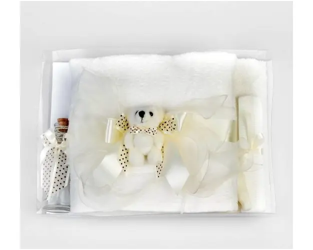Trusou botez ivory cu ursulet cod NK006 DESCRIERE Trusou complet de botez special creat pentru ceremonia de botez. Decorul prosopului este realizat dintr-o combinatie de funde ivory si ursuleti. Decorul prosopului este detasabil, astfel ca poti steriliza prosopul cu ajutorul aburilor fierbinti de la fierul de calcat. Dupa sterilizare, poti reatasa cu usurinta decorul. Trusoul pentru botez contine: prosop mare pentru bebelus, dimensiuni 70 x 140 cm, 100% bumbac; panza de mir, dimensiuni 100 x 110 cm, 100% bumbac; prosop pentru preot, dimensiuni 30 x 50 cm, 100% bumbac; fasa de botez, dimensiune 150 cm; sticluta de mir, capacitate 100 ml; sapunel in forma de bebelus. Trusoul este ambalat intr-o cutie transparenta. PERSONALIZARE Produsul se poate personaliza cu numele copilului. Numele copilului poate fi scris prin brodare pe prosopul copilului, panza si fasa (cost suplimentar). Daca doresti personalizare, alege la optiuni cu personalizare si te vom contacta telefonic pentru a stabili detaliile. Produsul cu denumirea Trusou botez ivory cu ursulet NK0006 face parte din brandul Produs vandut si livrat de sc denikos creativ shop online srl, se afla in categoria Barbie si subcategoria